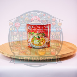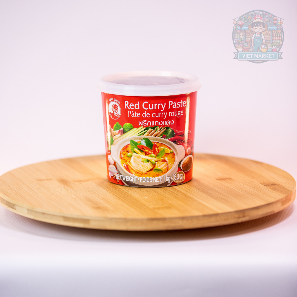 Červená kari pasta značky Cock (1 kg) je autentická thajská pasta vyrobená z kombinácie sušených červených čili papričiek, citrónovej trávy, cesnaku, šalotky, soli, kôry z kafírovej limetky, galangalu a korenín, ako sú koriandrové semienka a mletá rasca.