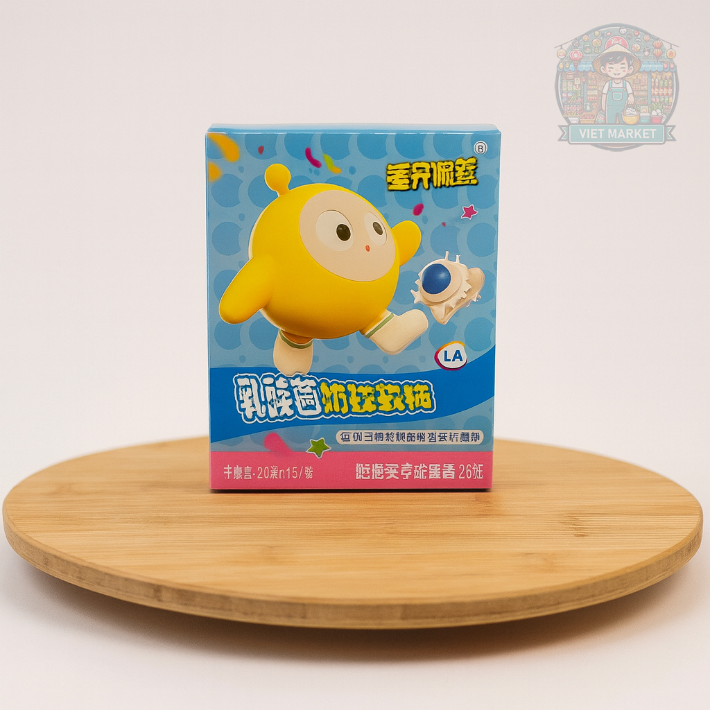 Zloženie: Glukózový sirup, Biely cukor, Rastlinná smotana bez mlieka (Glukózový sirup, Hydrogenovaný rastlinný olej, Mliečny prášok, Sodná soľ kazeinátu, Emulgátor [E471], Regulátor kyslosti [E340ii], Protihrudkujúca látka [E551], Aróma), Trehalóza, Srvátkový prášok, Želírovacie činidlo [E407], 67433, Koncentrovaná čučoriedková šťava (zodpovedá 25% pôvodnej šťavy), Vysoko koncentrovaný roztok fermentovaných baktérií kyseliny mliečnej (Voda, Biely cukor, Odstredený mliečny prášok, Baktérie kyseliny mliečnej (Lactobacillus rhamnosus, Lactobacillus fermentum, Lactobacillus paracasei, Lactobacillus helveticus, Streptococcus thermophilus, Lactococcus lactis subsp. lactis), Želírovacie činidlo [E440], Regulátor kyslosti [E331iii], Aróma), Emulgátor [E414], Aróma.